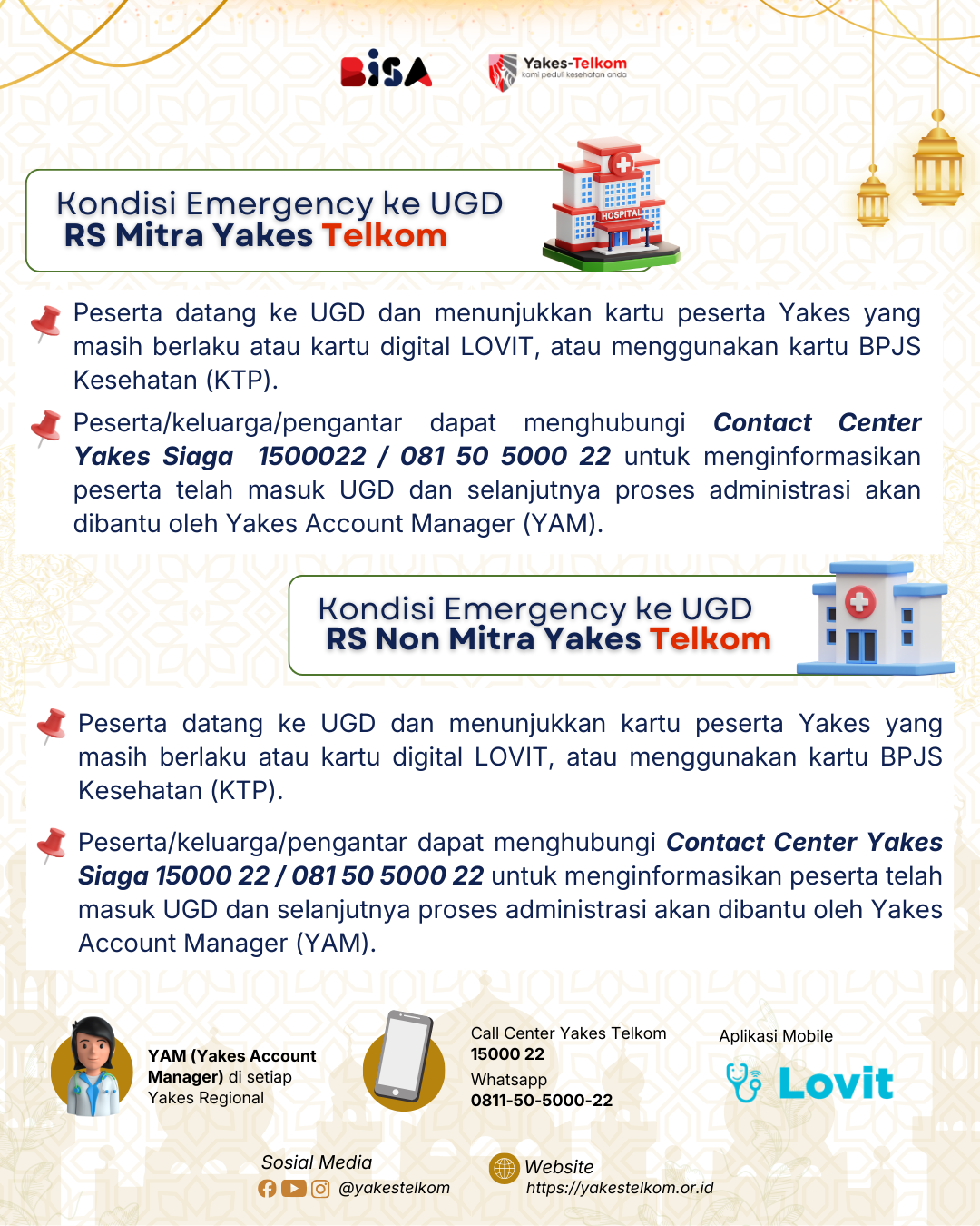 - Peserta dapat langsung menuju UGD Rumah Sakit Mitra Yakes Telkom atau UGD Rumah Sakit Non Mitra terdekat.