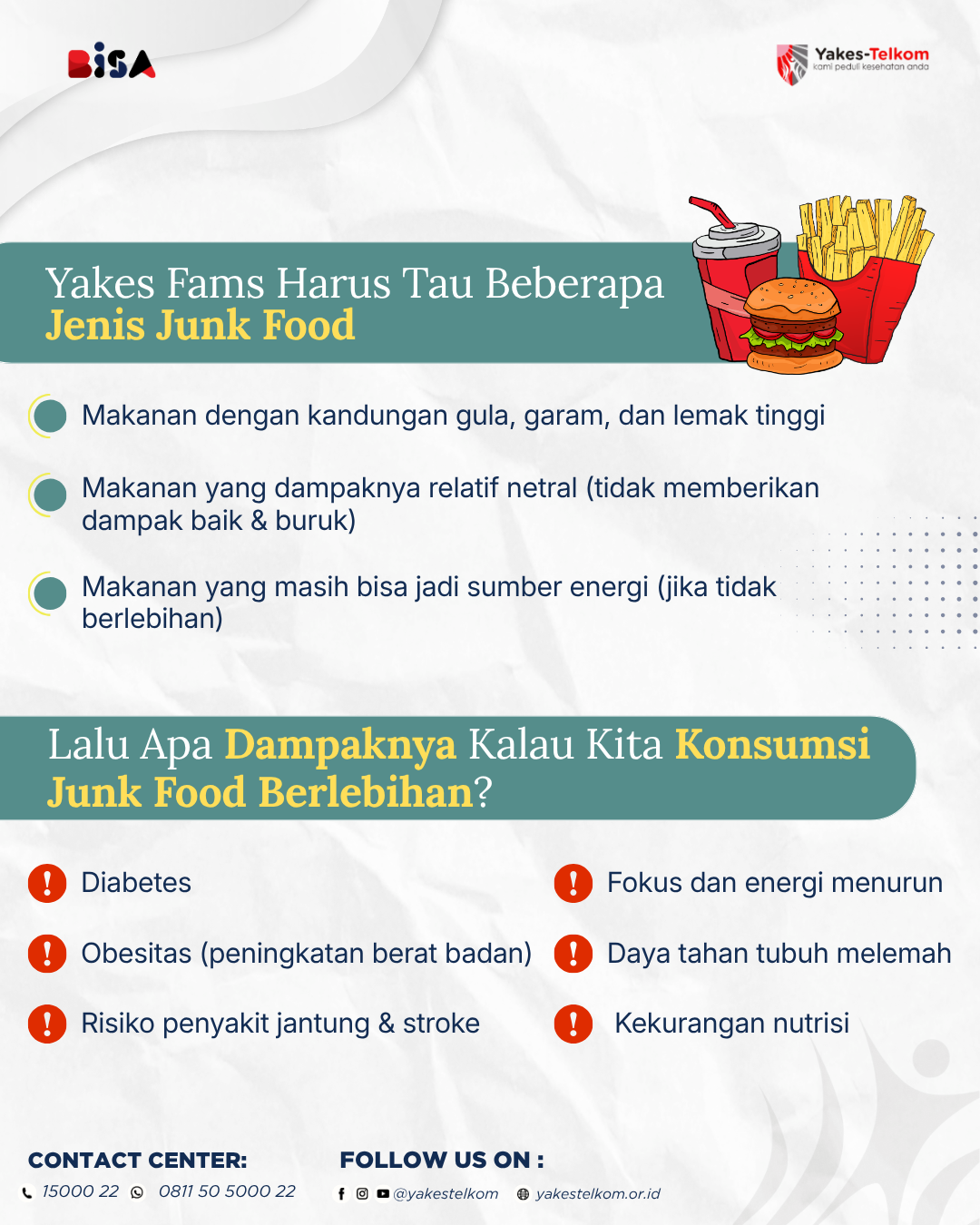 Di balik rasanya yang lezat, junk food umumnya tinggi gula, garam, dan lemak, namun rendah serat dan nutrisi penting. Jika dikonsumsi berlebihan, bukan cuma berat badan yang naik, tapi juga bisa meningkatkan risiko: