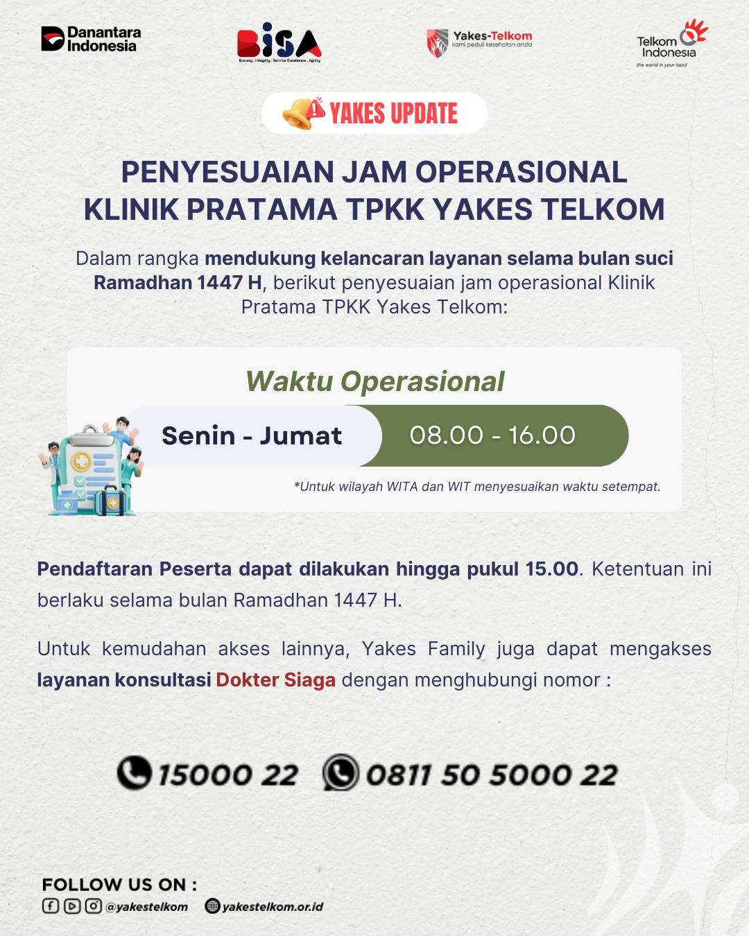 Dalam rangka mendukung kelancaran layanan kesehatan selama bulan suci Ramadan 1447 H, Klinik Pratama TPKK Yakes Telkom melakukan penyesuaian operasional layanan. Layanan tetap dibuka pada hari Senin –Jumat pukul 08.00 - 16.00. Khusus untuk pendaftaran peserta, dilayani sampai pukul 15.00 waktu setempat (WIB/WITA/WIT menyesuaikan wilayah).